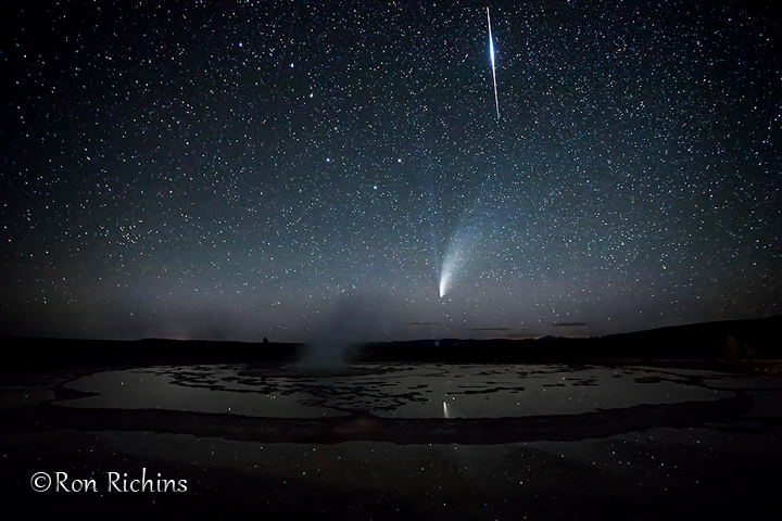 The Big Dipper, comet Neowise, and a meteorite converge over a resting geyser in Yellowstone.