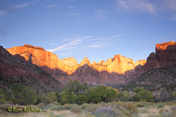 Sunlight strikes the top of Zion's Towers of the Virgin.