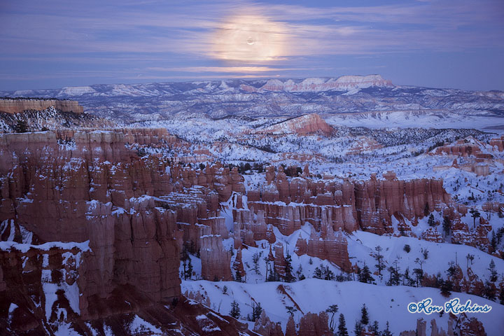 | A blue moon is a full moon which occurs twice in one month. To occur on New Year's Eve happens once every 20 years. This event took place December 31, 2009. The fascinating hoodoos of Bryce Canyon are illuminated by this rare moonlight. |
