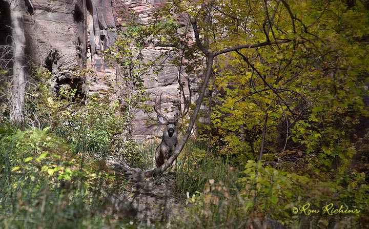 While hiking through the Zion Narrows, I came across something I never expected. As I came around one of the bends, a large male mule deer was foraging on the river bank. We both noticed each other immmediately, and since I was a safe distance away from him, he didn't run away. I quickly unpacked my camera and slowly started to approach him. Having tried this technique before, I soon realized I was just going to scare him away. So, I backed off and sat on a rock. After a few moments, his curiosity got the better of him, and he began to approach me to find out what I was. He came within 100 feet, and for several minutes he used all his senses to discern me. After discovering what I was, he turned and headed up river. I never saw him the rest of the day.