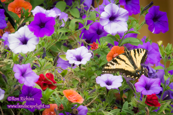 The Canadian Tiger Swallowtail Butterfly (Papilio canadensis) rests in a bouquet of flowers.
