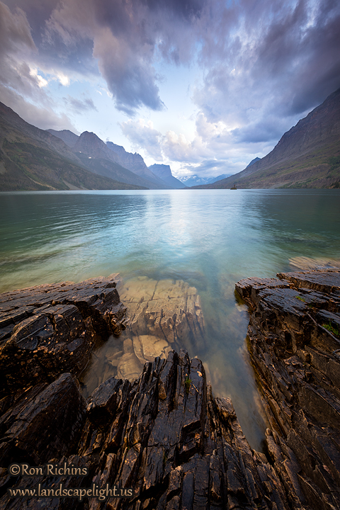 | Along the shoreline of St. Mary Lake in Glacier National Park. The sole reason for this composition was that I was trying to stay dry. A rainstorm quickly came through, and I knew I had two choices: seek shelter under some trees and risk being struck by lightning, or get wet. If I was struck by lightning I wouldn't care if I was wet or not, so I figured I'd go with the former option. While waiting for the storm to pass through, I wanted to take advantage of the interesting light and elements. |
