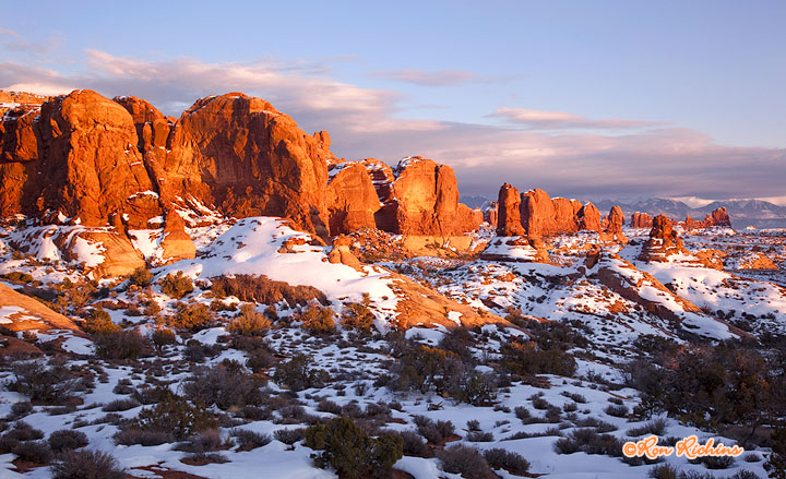 Snow covers the rocks in the Garden of Eden area of Arches National Park.